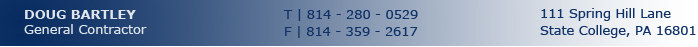 About Us Bartley Builders has been doing work in Central Pennsylvania since 1998. The company was founded by Master Carpenter Doug Bartley who wanted to work for a company that shared his passion for high quality workmanship and customer oriented service. Doug has since built the company and has assembled a friendly and experienced staff. In addition Bartley Builders has developed strong partnerships with other builders architects and engineers, building suppliers, and others in the construction industry. We know the blueprint for the successful execution of a project is as important as the blueprint for the project itself. That's why we develop accurate pre-construction budgets, as well as efficient and cost-saving construction methods. We stick to our timetables and complete projects on schedule. Doug Bartley believes that our reputation is extremely important. Doug's hands-on approach to each job ensures that you will receive the finest quality and the highest level of professionalism. Doug's focus is on you, the client, bringing his experience to create customer satisfaction. He is only a phone call away if you have questions or concerns during, before or after a job. We have an extensive network of satisfied customers that will be happy to talk to you about their experiences. In fact most of our work originates from referrals from satisfied customers.